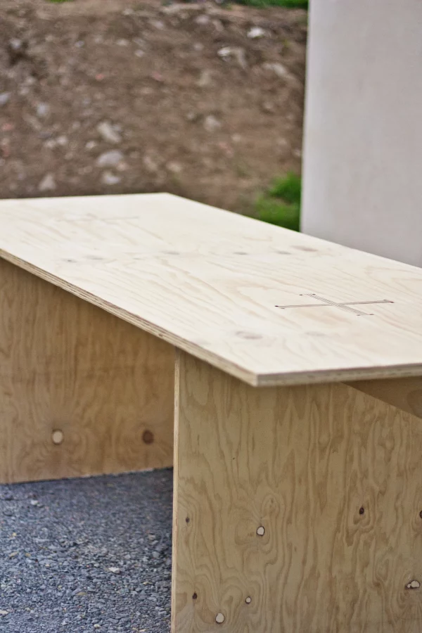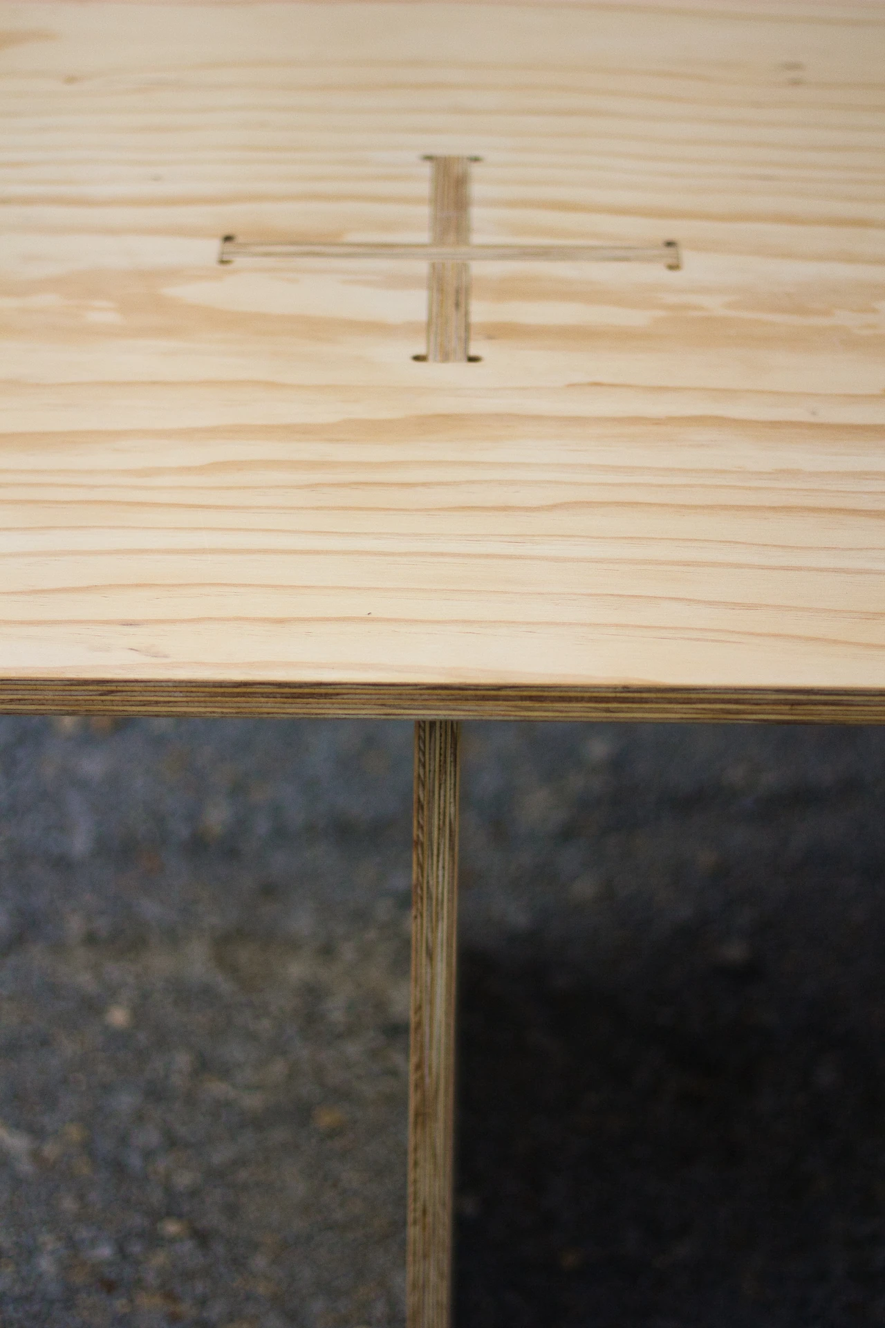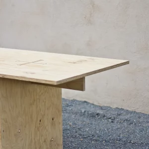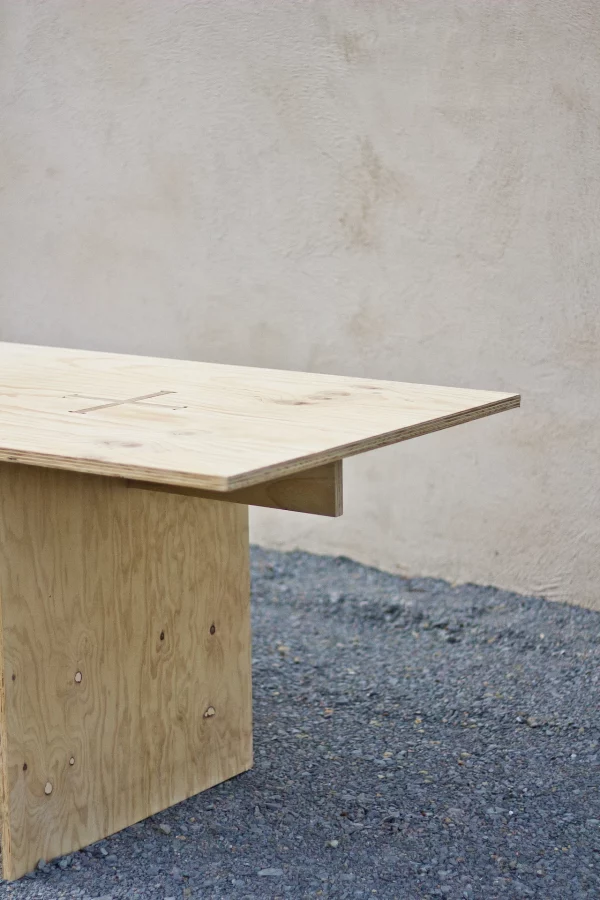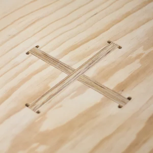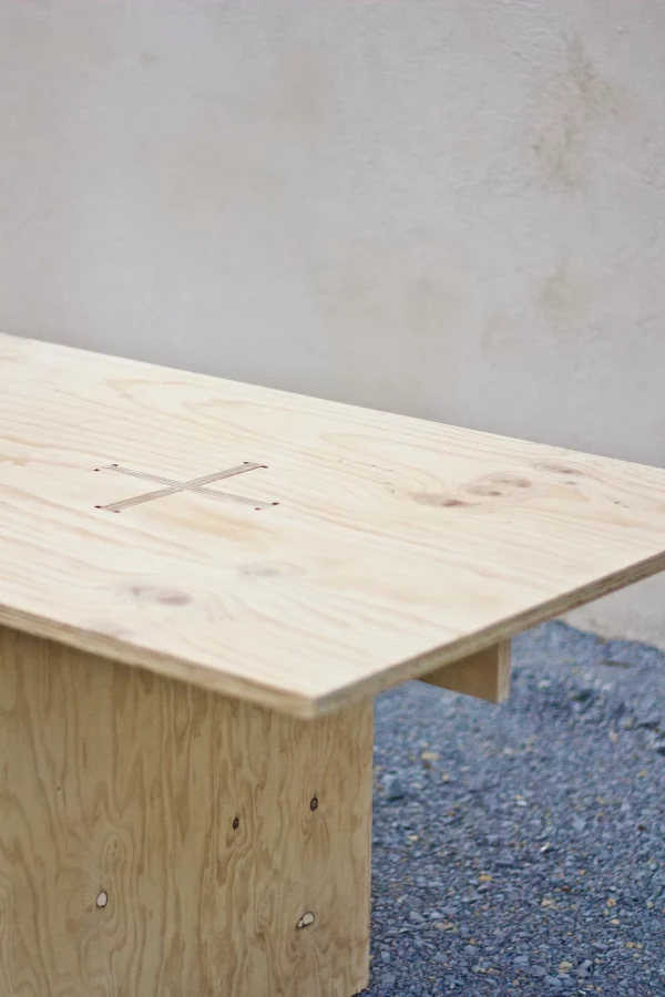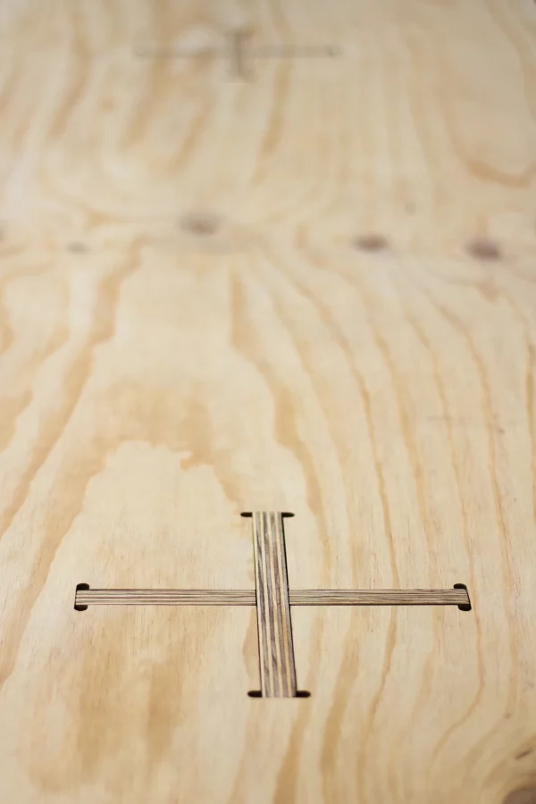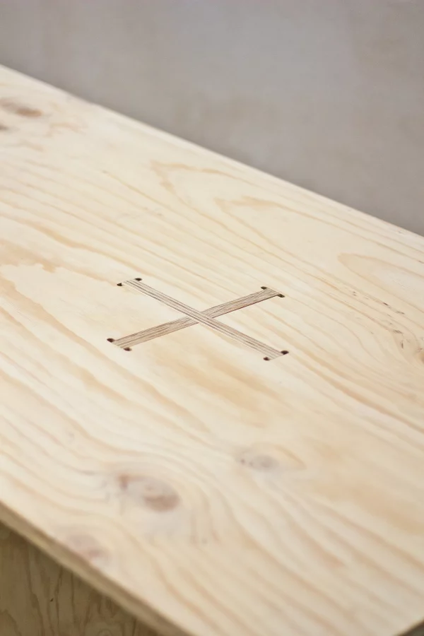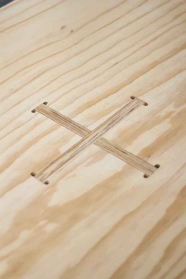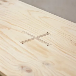 Les quatre peces massisses de contraxapat de pi o bedoll s’entrellacen amb la mateixa sintaxi formal que els antics monuments, creant una estructura sòlida i equilibrada. La junta central en forma de creu, un punt de connexió entre tradició i modernitat, contrasta amb la fluïdesa orgànica de les vetes de la fusta massissa.