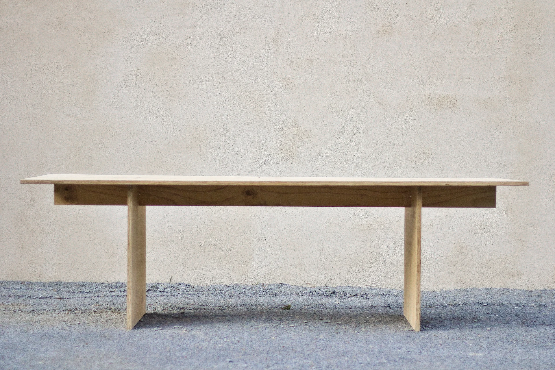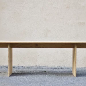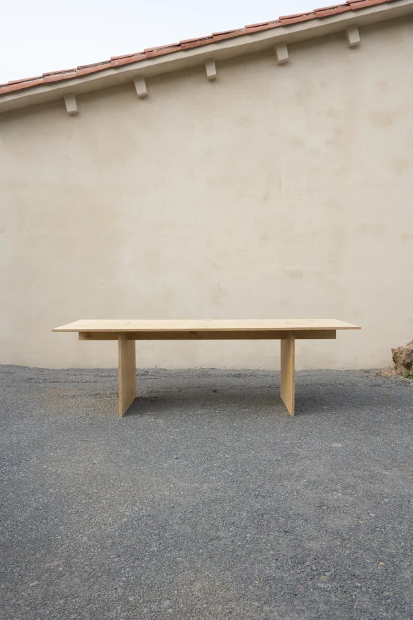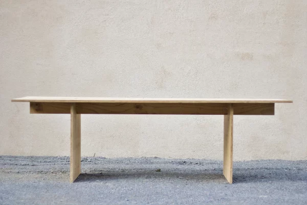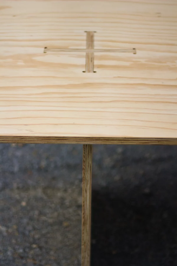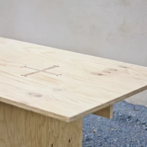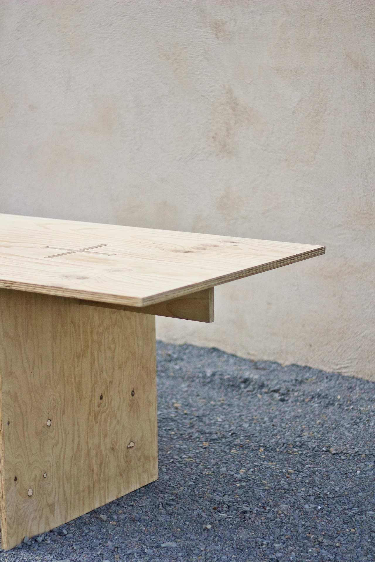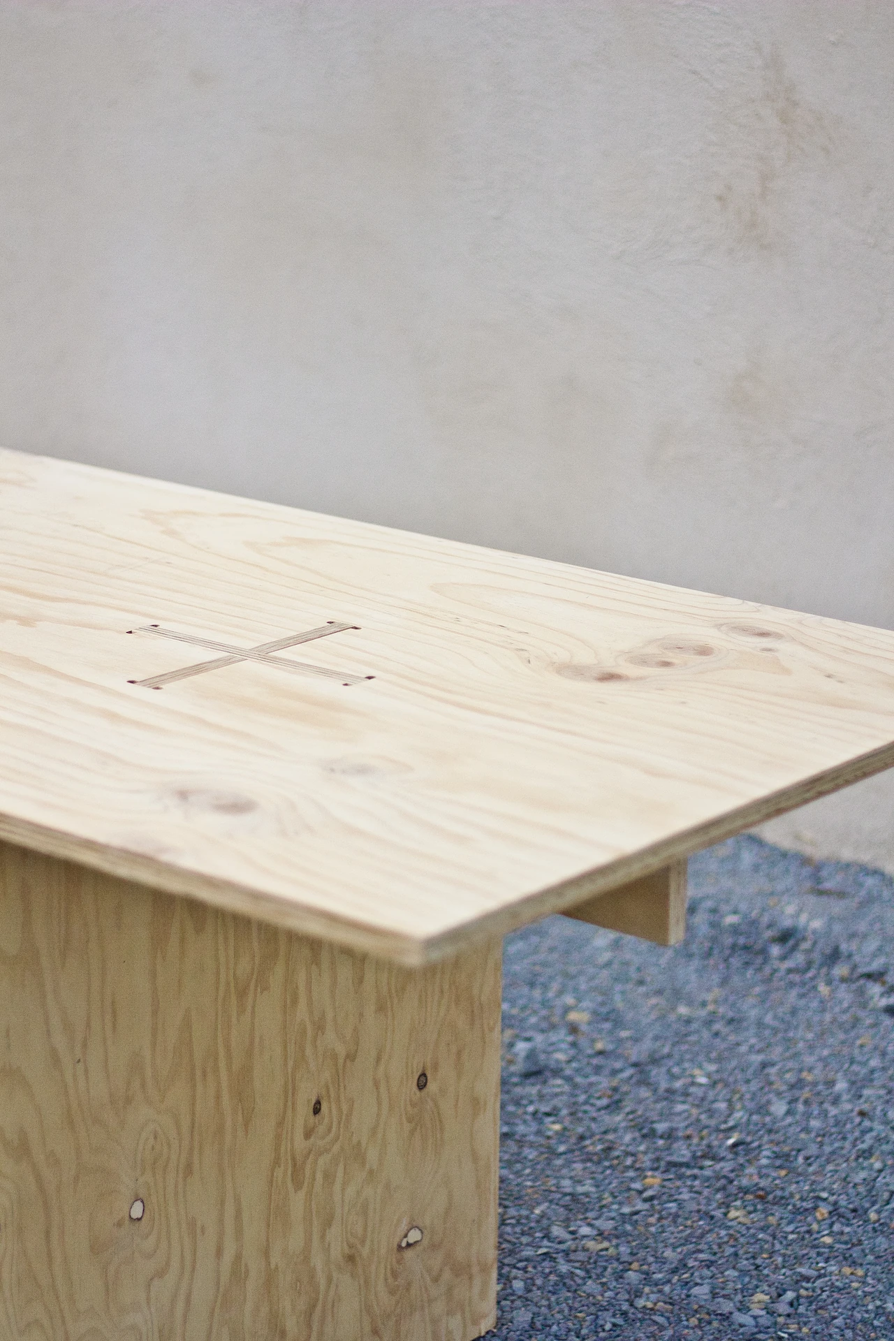 Les quatre peces massisses de contraxapat de pi o bedoll s’entrellacen amb la mateixa sintaxi formal que els antics monuments, creant una estructura sòlida i equilibrada. La junta central en forma de creu, un punt de connexió entre tradició i modernitat, contrasta amb la fluïdesa orgànica de les vetes de la fusta massissa.